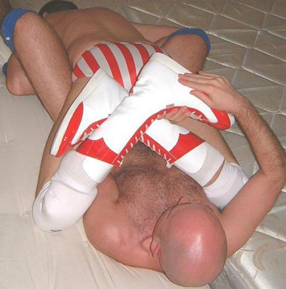 blue wrestling boots together and straightens his legs for maximum pressure.