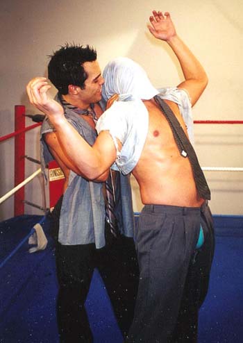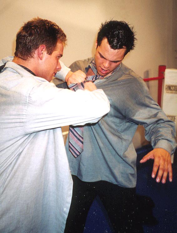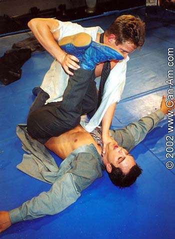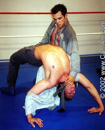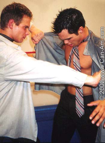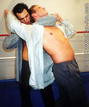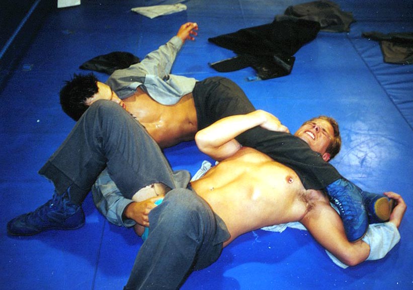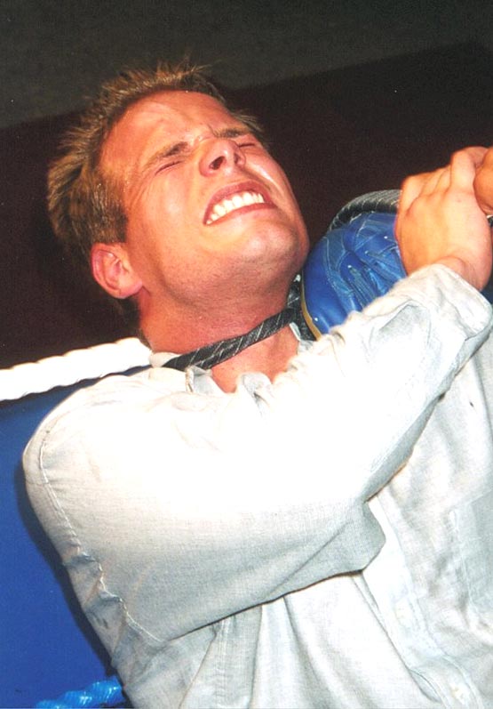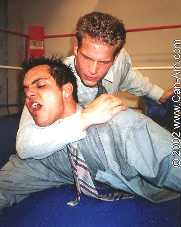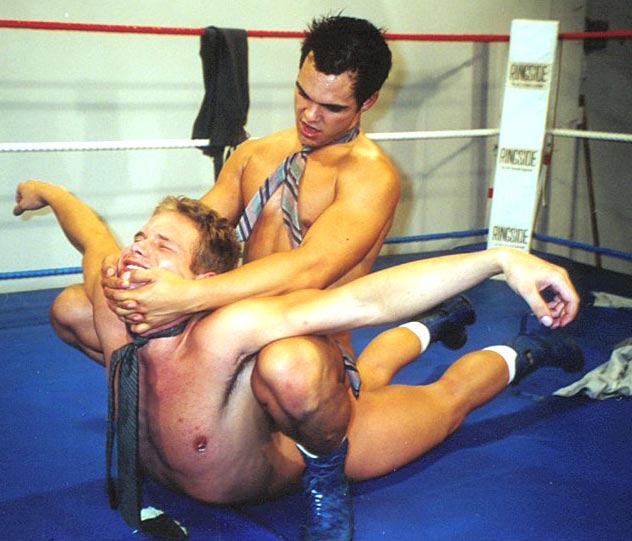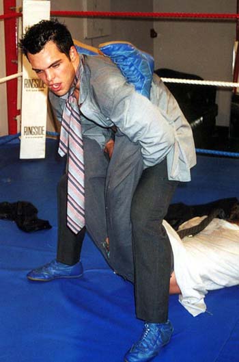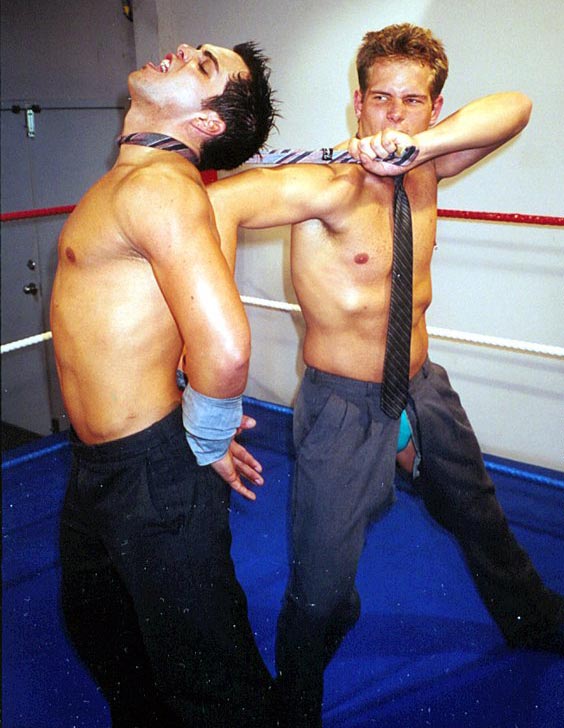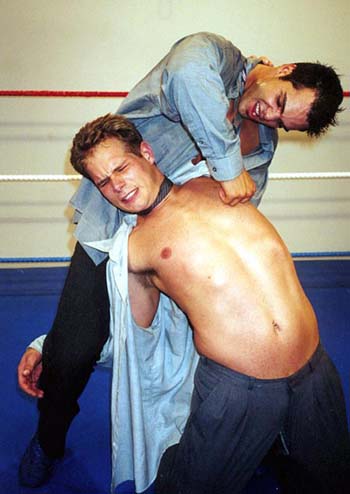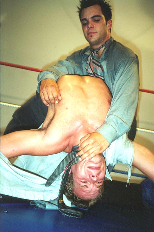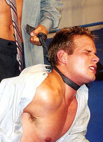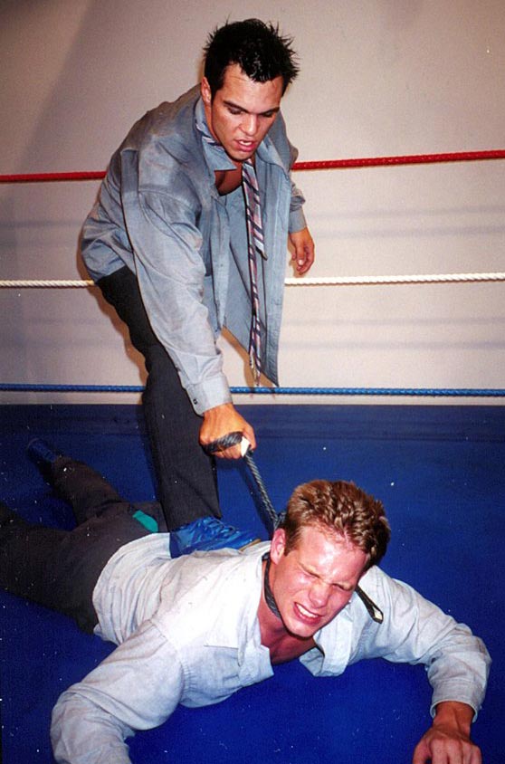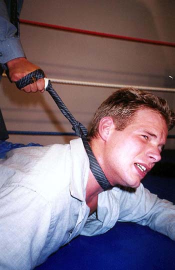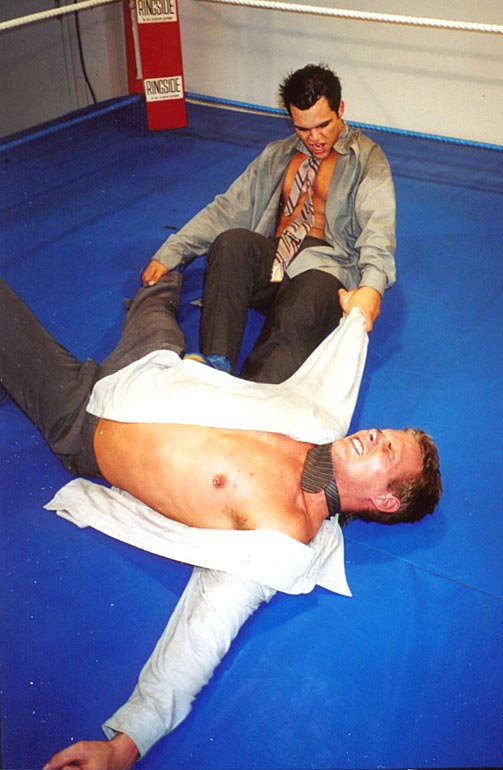 me whipping the cute stud to the mat and choking him with his neck-tie, my